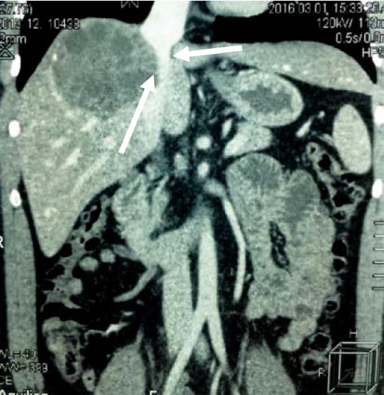 Для дальнейшего углубленного обследования и определения тактики лечения переведен в клинику военно-морской хирургии Военно-медицинской академии имени С.М. Кирова. В клинике выполнено комплексное клинико-лучевое обследование. При мультиспиральной компьютерной томографии (МСКТ) головы, грудной клетки, брюшной полости подтверждено наличие эхинококковой кисты правой доли печени около 10 см, которая сдавливает нижнюю полую вену (рис. 2, 3). В других органах и тканях эхинококк не выявлен. Пациент проконсультирован паразитологом – выставлен диагноз: эхинококковая киста печени.
