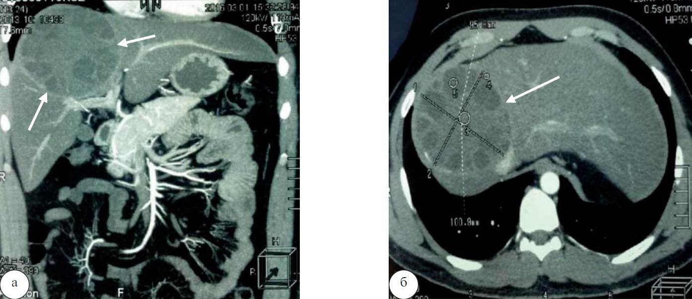 Результаты и их обсуждение. Военнослужащий срочной службы Т., 1989 г.р., в Вооруженных силах РФ с 20 апреля 2015 г., проходил службу в качестве повара воинской части. На фоне полного благополучия в январе 2016 г. проходил медицинское освидетельствование для поступления на военную службу по контракту. При ультразвуковом исследовании (УЗИ) выявлена киста печени диаметром около 10 см. С целью дополнительного обследования был направлен в военный госпиталь по месту службы. При обследовании в анализах крови патологии не выявлено. Вирусные гепатиты В и С не выявлены, антитела к вирусу иммунодефицита человека отрицательные. Выполнен иммуноферментный анализ на эхинококк, который был положительным. При контрольном УЗИ определялась многокамерная киста правой доли печени диаметром около 10 см (рис. 1).