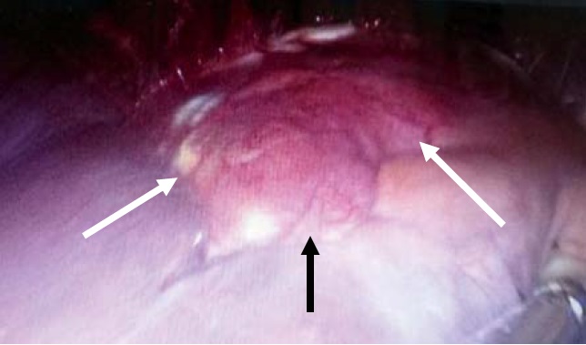 22.03.2016 под эндотрахеальным наркозом выполнена диагностическая лапароскопия для оценки степени поражения печени и определения возможности минимально инвазивного удаления кисты. При осмотре печени на передней поверхности в проекции S4, S7, S8 визуализируется кистозное образование, покрытое фибрином (рис. 4).