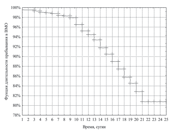 Из таблицы 7 следует, что степень влияния на длительность пребывания в медицинских воинских частях (подразделениях) и ВМО в 59,73% случаев зависит от суммы от факторов «Уровень оказания медицинской помощи (военно-медицинская организация)» Х2 и «Вид ранящего агента» Х25. Вклад остальных факторов оказался несколько меньшим. На рисунке представлено, что более 80% военнослужащих, получивших повреждения вследствие минно-взрывных повреждений, продолжат свое лечение в ВМО более 21 суток.