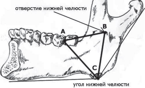 Наряду с этим нами введено новое понятие «углового треугольника», сторонами которого являются АВ – ретромолярное расстояние; ВС – расстояние от отверстия нижней челюсти до ее угла; АС – расстояние от угла нижней челюсти до дистального края второго нижнего моляра (рис. 1).