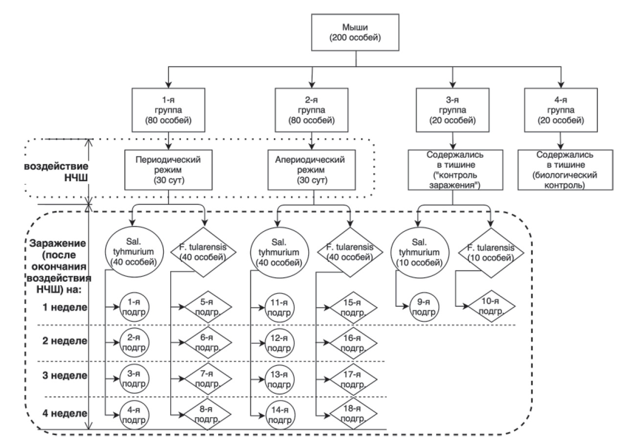 Исследование проводили поэтапно: первоначально мышей подвергали шумовому воздействию в низкочастотном диапазоне в периодическом (5 дней в неделю в течение 1 часа) и апериодическом режимах (2,5 часа два раза в неделю) в течение 30 суток. Затем заражали возбудителями инфекций (брюшного тифа – Sal. typhimurium и туляремийной – F. tularensis) на 1–4-й неделе после окончания шумового воздействия.