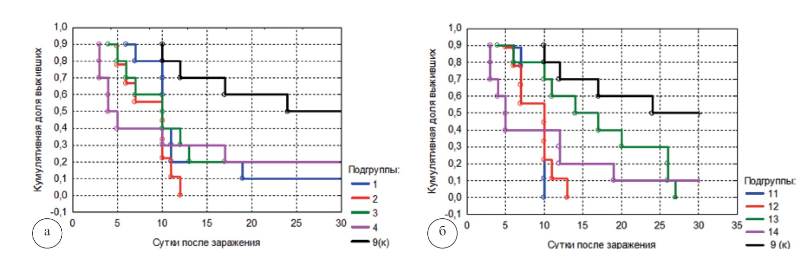 Динамику выживаемости животных представляли графически по оценкам Каплана – Каплана – Мейера: по оси Х – время жизни (в днях), по оси Y – кумулятивная доля выживших. Для каждого режима и времени воздействия НЧШ, а также вида возбудителя на одном графике для наглядности помещены несколько графиков по неделям заражения (1, 2, 3, 4) вместе с соответствующей контрольной группой. Сравнение выживаемости мышей в группах проводили по непараметрическому критерию Вилкоксона – Гехана. Для количественных сравнений применялся критерий χ2 с поправкой Йетса.