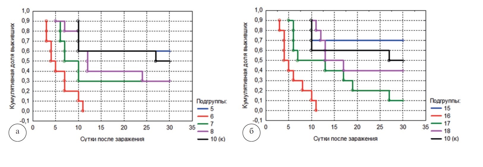 Рис. 3. Динамика выживаемости животных, подвергнутых заражению F. tularensis, предварительно находившихся под шумовым воздействием: а - НЧШ 1 ч/сут 5 раз в неделю в течение 30 сут (периодический режим); б – НЧШ 2,5 ч/сут по 2 раза в неделю в течение 30 сут (апериодический режим)