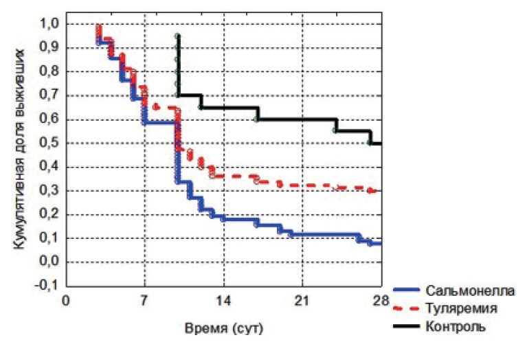 В обоих случаях возбудителей вводили внутрибрюшинно (Sal. typhimurium –0,5 мл, F. tularensis – 0,2 мл). Контроль специфичности гибели животных подтверждали микробиологическим методом идентификации возбудителей.