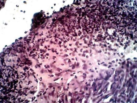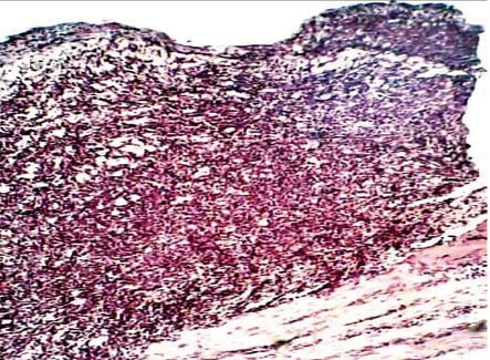 Рис. 2. Морфологическая картина раны при лечении диметилсульфоксидом на 4-е сут от начала наблюдения. Наблюдается выраженная нейтрофильная инфильтрация раны с интерстициальным отеком, в глубине – формирование грануляционной ткани. Окраска гематоксилин-эозином, ок. х7, об. х40