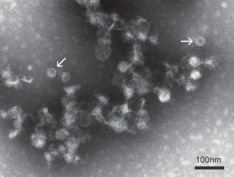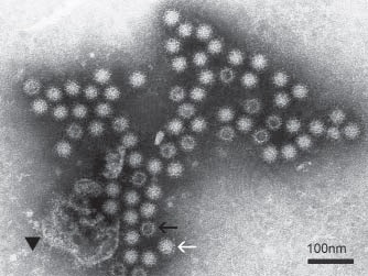 Рис 1. Очищенный концентрат норовируса человека, содержащий частиц в 1 мл диаметром 27–32 нм. Полноценные частицы – светлая стрелка; неполноценные частицы с проникшим внутрь контрастирующим веществом – темная стрелка; фрагменты клеточных мембран – треугольная стрелка. Негативное контрастирование фосфорно-вольфрамовой кислотой