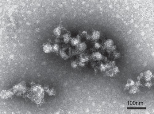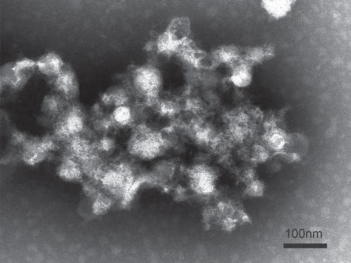 Рис. 3. Концентрат норовируса после 30 мин обработки средством «Дезавид» в рабочей концентрации. В препарате наблюдаются только бесформенные коагуляты, состоящие из денатурированных белков норовируса. Интактных вирусных частиц не обнаружено. Негативное контрастирование фосфорно-вольфрамовой кислотой