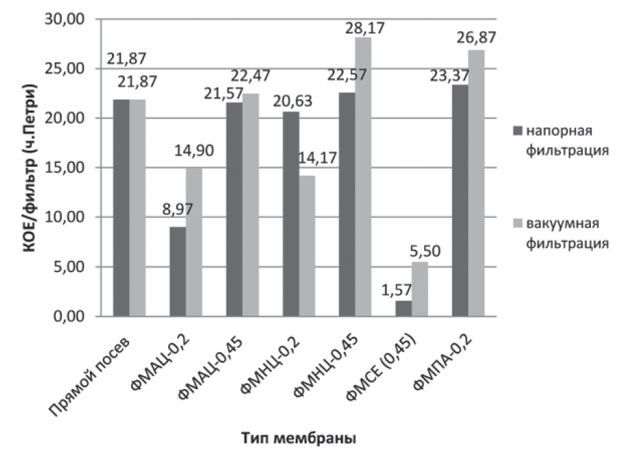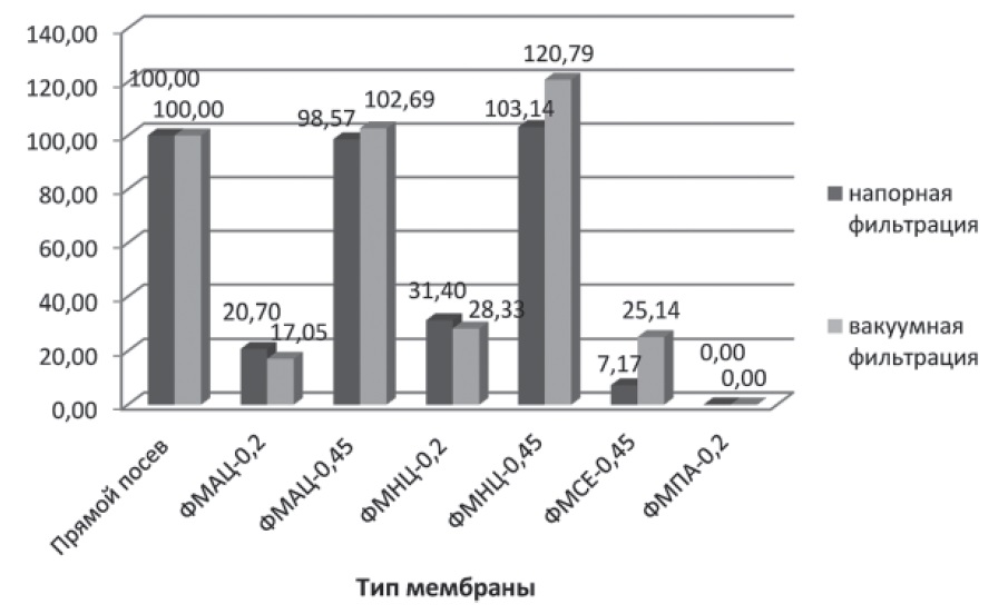 Результаты и их обсуждение. Наибольшая эффективность сорбции E.coli при бактериологическом посеве методом мембранной фильтрации получена на ФМ (рис. 1).