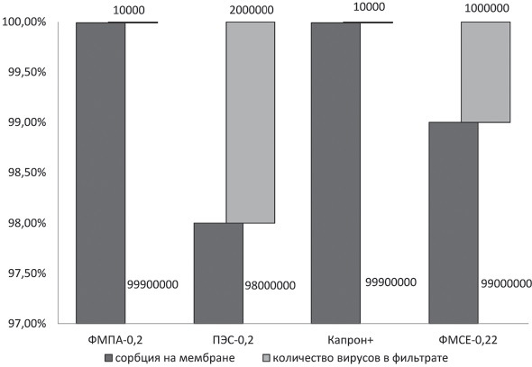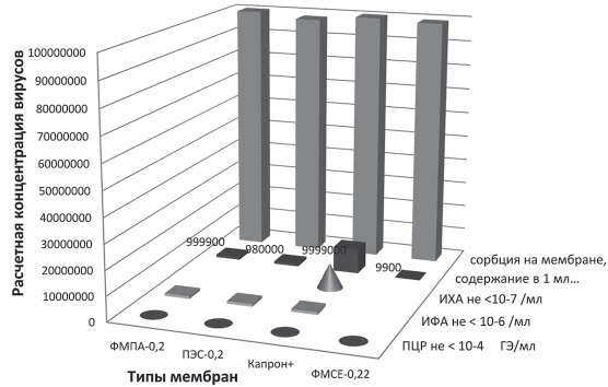 Рис. 3. Графическая характеристика сорбции ротавирусов на исследуемых мембранах при фильтрации 0,01 л контаминированной ротавирусами воды в концентрации не < /мл, n=10