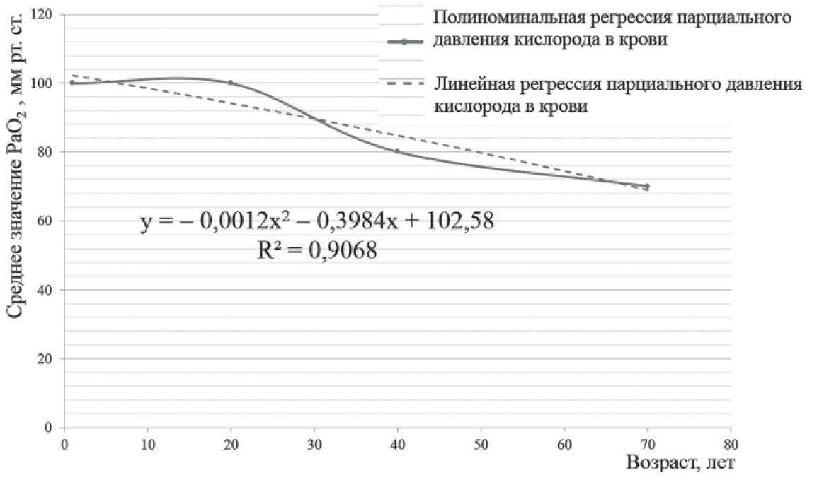 Основной сложностью количественной объективизации при оказании медицинской помощи пострадавшим при отравлении СО стало принятие сортировочного решения среди тяжело отравленных и очередности проведения ГБО при групповом отравлении. Традиционно по данным источников это решение принимается на основе на уровня HbCO в крови пострадавших, однако технические возможности портативного газоанализатора не позволяли выполнить его определения. Для решения данной проблемы, на основании клинических данных был разработан способ для модели отравлений средней и тяжёлой степени, который может применяться в отсутствие полноценного определения ДФГ. PaО2 в артериальной крови здоровых молодых людей в среднем составляет 95–100 мм рт. ст.; к 40 годам оно снижается примерно до 80 мм рт. ст., а к 70 годам – до 70 мм рт. ст. Эти изменения связаны с тем, что с возрастом увеличивается неравномерность функционирования различных участков легких. Для облегчения расчёта должного значения РаО2 нами была предложена формула полиноминальной регрессионной кривой зависимости должного РаО2 от возраста, с учётом которой возможно дальнейшее вычисление наличия в крови ДФГ (рис. 1).