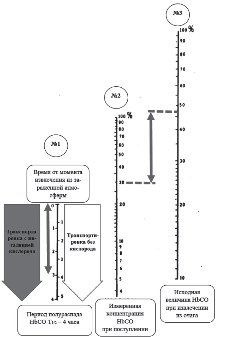 Время от момента эвакуации пострадавших из очага поражения до поступления в стационар и забора крови для анализа газового состава составило около 3 ч. Транспортировка проводилась в условиях кислородотерапии, что позволяет замерить расстояние по шкале номограммы № 1 от 0 до 3, далее полученный отрезок отложить по шкале номограммы № 2 от значения «30%» (полученное значение содержания ДФГ в нашем случае) и спроецировать его верхнюю точку на шкалу номограммы № 3, что позволит определить исходное значение содержания карбоксигемоглобина, равное 48%. Таким образом, при известном времени, прошедшем с момента эвакуации пострадавших из очага поражения СО, характере медицинской помощи в процессе транспортировки на догоспитальном этапе, возрасте пострадавших и величине РаО2 при поступлении можно судить об исходных значениях суммарных фракций ДФГ на момент отравления.