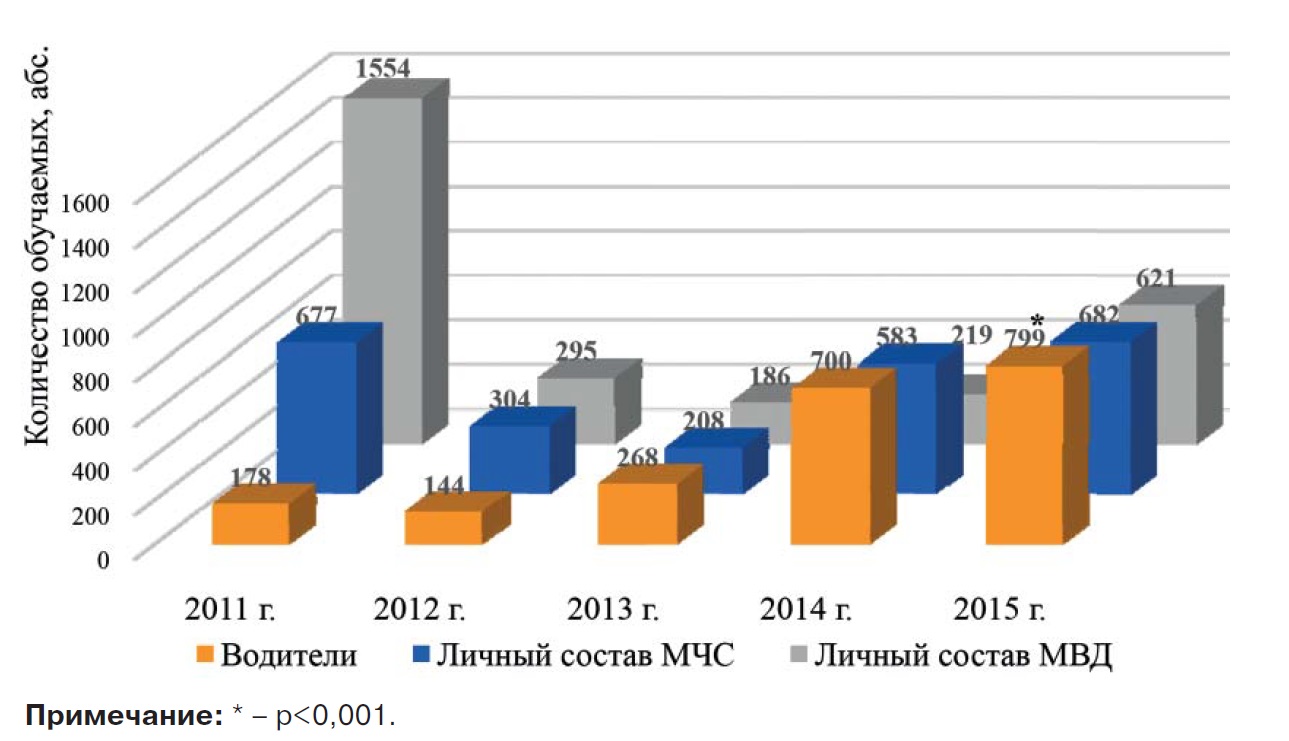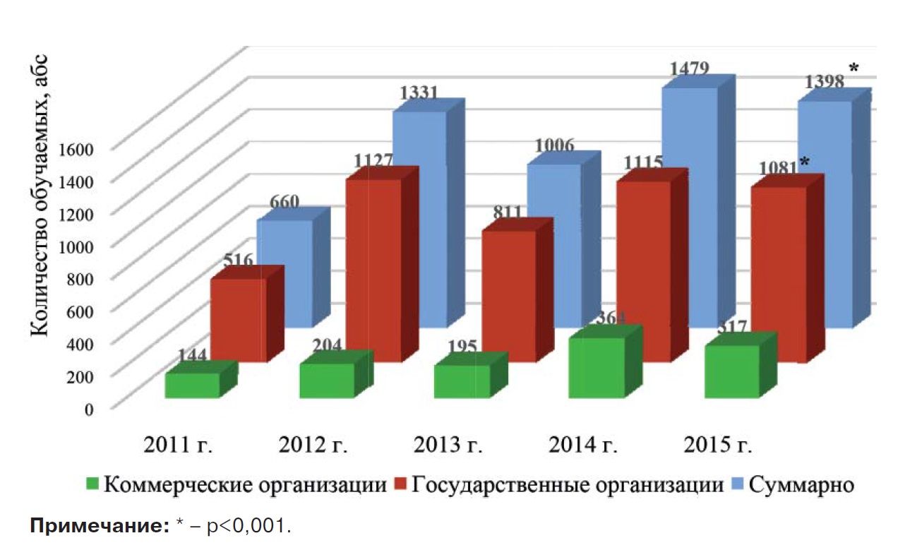 Возрастает интерес среди руководителей государственных и коммерческих организаций области к обучению своих сотрудников. Среди них работники сети автодорожного сервиса, стюардессы, проводники железнодорожных вагонов, представители охранных структур, спасатели различных ведомств и прочие специалисты, работа которых так или иначе связана с большим количеством людей. Так, если в 2011 г. суммарное их количество составило 660 человек, то в 2015 г. возросло до 1398 человек (р<0,001) (рис. 2).
