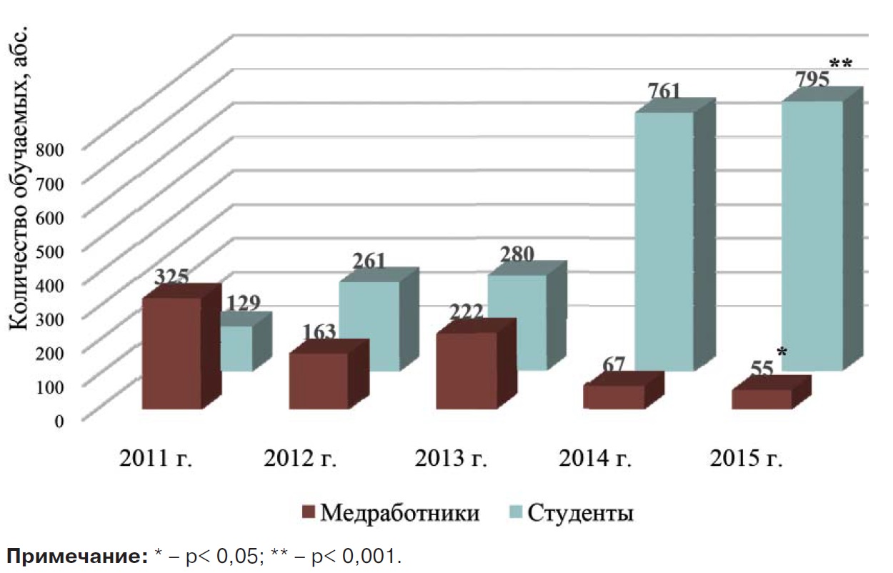 Материалы и методы. Материалом исследования послужили журналы регистрации посещения занятий обучаемым контингентом в учебно-методическом отделе (УМО) «Школа медицины катастроф» территориального центра медицины катастроф (ТЦМК) за период с 2011 по 2015 г.