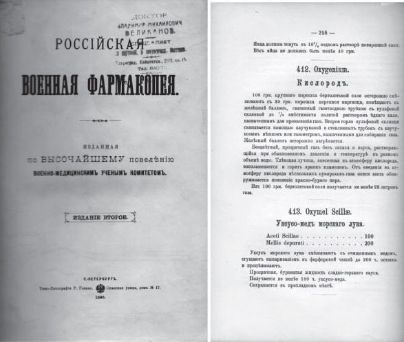Рис. 1. Фармакопейная статья на кислород медицинский (Российская военная фармакопея, 1896 г.)