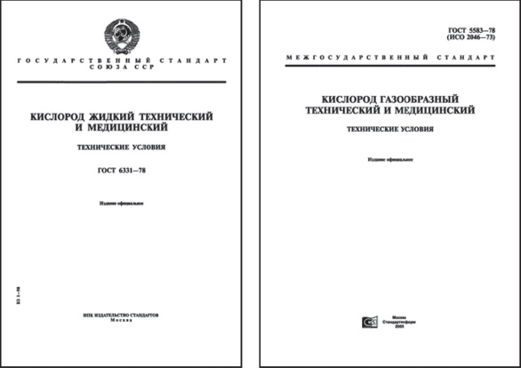 Рис. 2. Титульные листы ГОСТ 6331-78 «Кислород жидкий технический и медицинский», ГОСТ 5583-78 «Кислород газообразный технический и медицинский»
