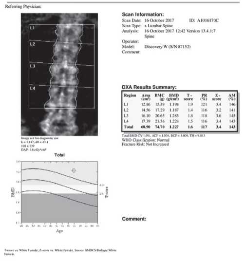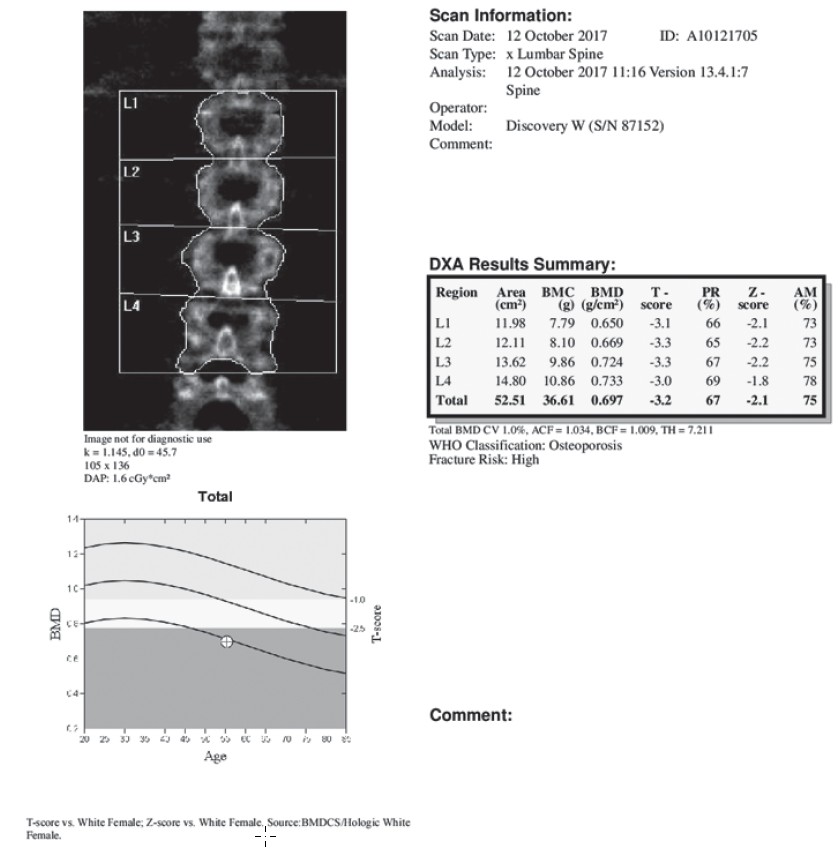 Т-критерий = —3,2; Z-критерий = —2,1. Минерализация костей поясничного отдела позвоночника соответствует остеопорозу.