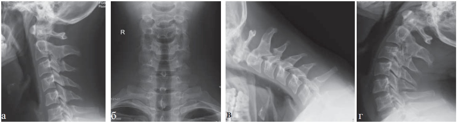 Рис. 2. Рентенография шейного отдела позвоночника, та же пациентка: а — прямая проекция; б — боковая, в — в положении максимального сгибания; г — в положении максимального разгибания. Определяются нарушение статики, начальные явления остеохондроза шейного отдела позвоночника (I степень).