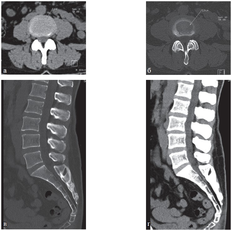 Рис. 3. КТ поясничного отдела позвоночника, та же пациентка: а, б — аксиальная плоскость;