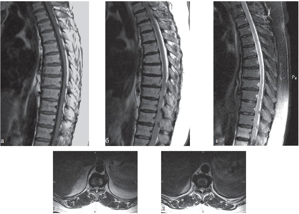 Рис. 4. МРТ грудного отдела позвоночника, та же пациентка: а -Т1-ВИ; б, г, д — Т2-ВИ; в — Т2-ВИ с жироподавлением. Определяется остеохондроз грудного отдела позвоночника I ст., умеренное снижение высоты тел ТН6—ТН9, грыжи Шморля в краниальных и каудальных пластинках тел ТН6-ТН10, признаки перенесенной болезни Шейермана-Мау.