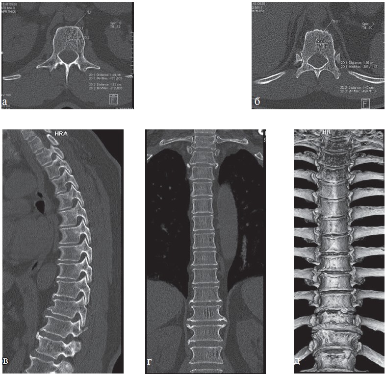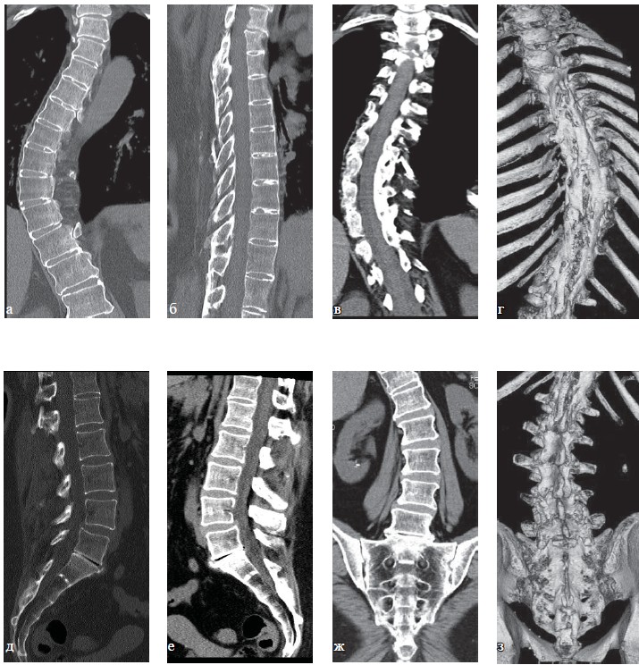 Рис. 9. КТ грудного отдела позвоночника (а—г). Больная С., 63 года. Определяется частичная оссификация передней продольной связки, полная оссификация межостистой связки на уровне грудного отдела позвоночника, костный блок тел позвонков Th4—Th10, костный анкилоз дугоотростчатых суставов Th3—Th12 (проявления болезни Бехтерева), снижение высоты межпозвонковых дисков. Имеются проявления субхондрального склероза замыкательных пластин тел позвонков, обызвествление передней продольной связки, проявления остеоартроза реберно-поперечных суставов, остеоартроза реберно-позвонковых суставов, дугоотростчатых суставов, передний дегенеративный спондилолистез позвонков Th2 и Th3 до 4 мм, S-образный сколиоз грудо-поясничного отдела позвоночника 3 степени.