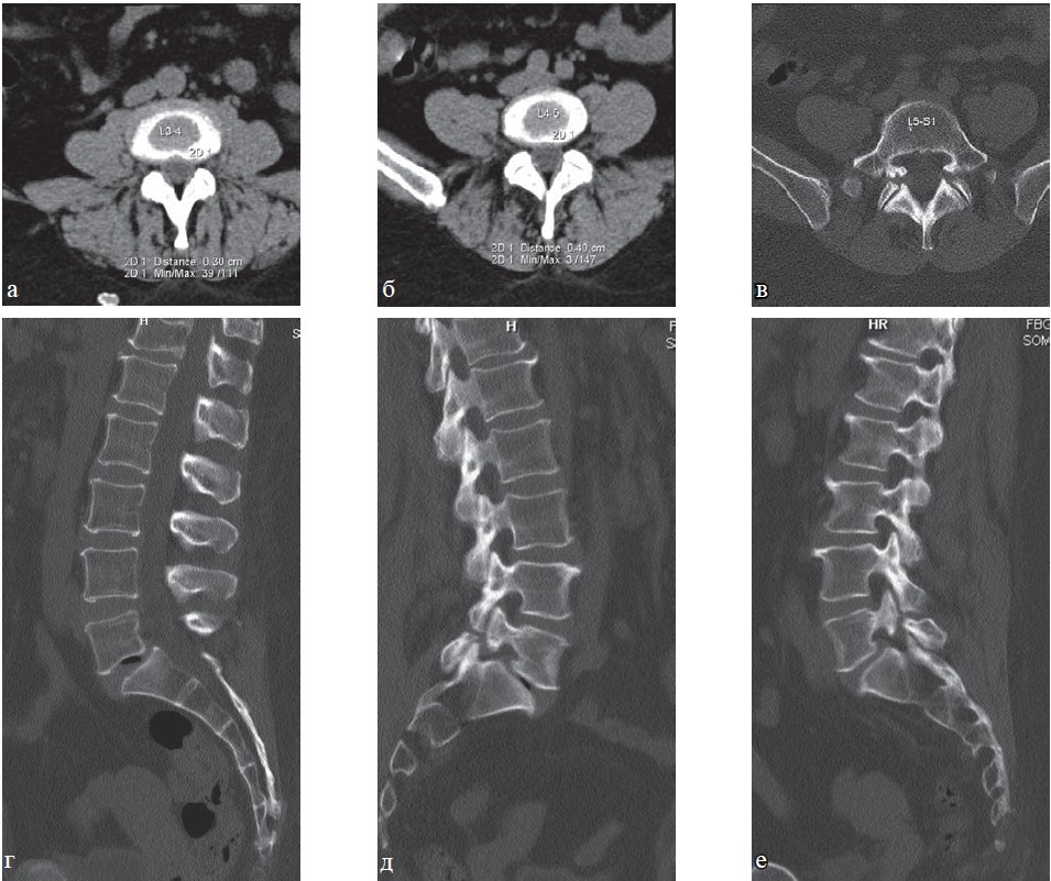Рис. 6. КТ поясничного отдела позвоночника, больная Н., 58 лет: а—в — аксиальная плоскость; г—е —сагиттальная плоскость. Определяется остеохондроз поясничного отдела позвоночника II степени, протрузия межпозвонкового диска L3—4, грыжа межпозвонкового диска L4—5, спондилоартроз, спондилолиз дуги позвонка L5, задний спондилолистез позвонка L4 I степени, передний спондилолизный спондилолистез позвонка L5 I степени.