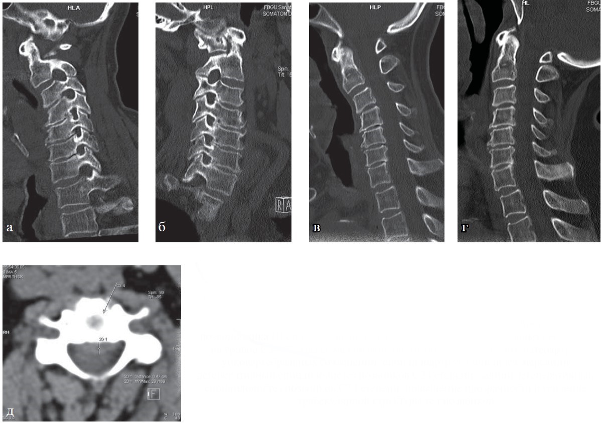 Рис. 8. КТ шейного отдела позвоночника. Больная Х., 76 лет: а, б — сагиттальная плоскость в статическом положении; в, г — при выполнении функциональных проб; д — аксиальная плоскость. Определяется остеохондроз шейного отдела позвоночника III степени с наличием гипомобильности двигательных сегментов на уровне C3—C7, грыжа межпозвонкового диска С3—4 до 5 мм, остеоартроз унковертебральных сочленений, спондилоартроз, спондилез, передний дегенеративный спондилолистез позвонков С2 I степени, задний дегенеративный спондилолистез позвонков С7 I степени, повышение прозрачности и усиление трабекулярной структуры тел позвонков.