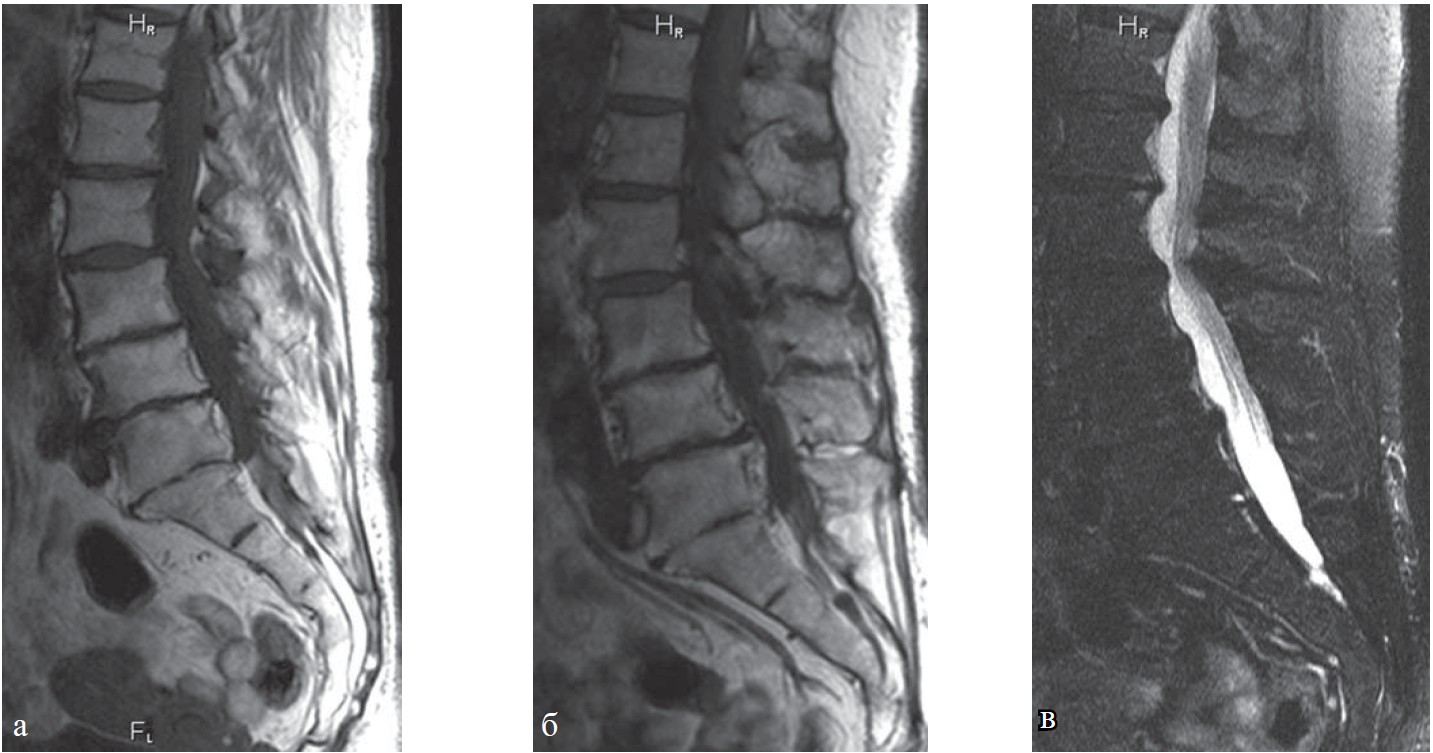 Рис. 10. МРТ поясничного отдела позвоночника в сагиттальной плоскости. Больная Д., 58 лет: а — Т1-ВИ, б — Т2-ВИ, в — МР-миелография. Остеохондроз пояснично-крестцового отдела позвоночника IV степени, протрузии межпозвонковых дисков Th12-L1, L1-L2, L2-L3. Грыжи межпозвонковых дисков L3-L4, L4-L5. Деформирующий спондилез, спондилоартроз, передний спондилолистез L2 I ст. Узкий дегенеративный позвоночный канал.