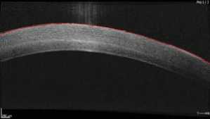 Рис. 3. Гиперрефлективный сигнал от передней стромы роговицы при ОКТ-исследовании роговицы демаркационной линии при ОКТ-исследовании роговицы.
