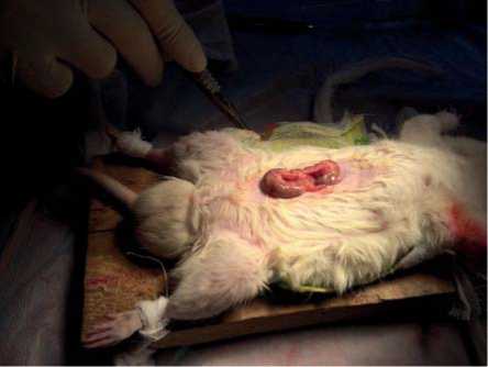 Общую анестезию проводили путём ингаляционной наркотизации животных диэтиловым эфиром в специальной камере. По достижении достаточной степени медикаментозной седации животных взвешивали, готовили операционное поле и производили забор венозной крови одноразовым венозным катетером 24G из хвостовой вены. С целью моделирования эвентрации в асептических условиях осуществляли срединную лапаротомию длиной 12 мм и послойно вскрывали брюшную полость. По её завершении петлю тонкой кишки выводили на переднюю брюшную стенку, а затем покрывали стерильной салфеткой с пропиткой, как представлено на рисунках 1 и 2.