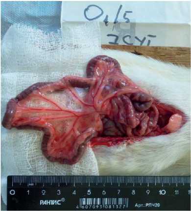 Наличие фибрина на петлях эвентрированной кишки отмечено у половины животных 1-й группы, одного из 7 (14%) - во 2-й группе и у одного из 8 (12%) животных в 4-й и 5-й группах. В 3-й и 6-й группах фибрин отсутствовал.