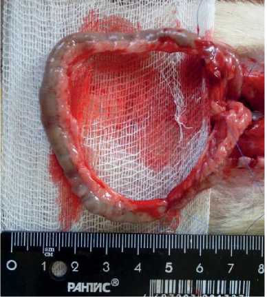 Спустя 48 ч и 7 сут. после наложения повязки под общей анестезией в рандомизированном порядке половине животных из группы проводили релапаротомию, ревизию органов брюшной полости, оценку выявленных осложнений и осуществляли резекцию участка тонкой кишки, как представлено на рисунках 5 и 6.
