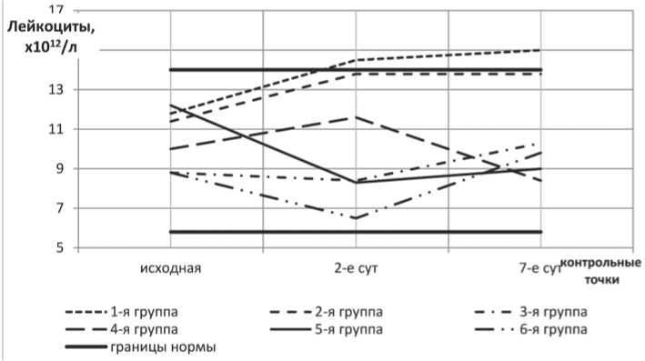 Так, относительный рост количества лейкоцитов на 2-е сутки наблюдался в 1-й группе - на 16%, во 2-й - на 21%, и в 4-й - на 16%, что свидетельствует о наличии воспалительного процесса, а также активации иммунитета. К 7-м суткам в 4-й группе уровень лейкоцитов вернулся к исходному, а в контрольных не изменился (2-я группа) или продолжил повышаться (1-я группа). В 3-й, 5-й и 6-й группах колебания количества лейкоцитов были незначительными и диагностического значения не имели.