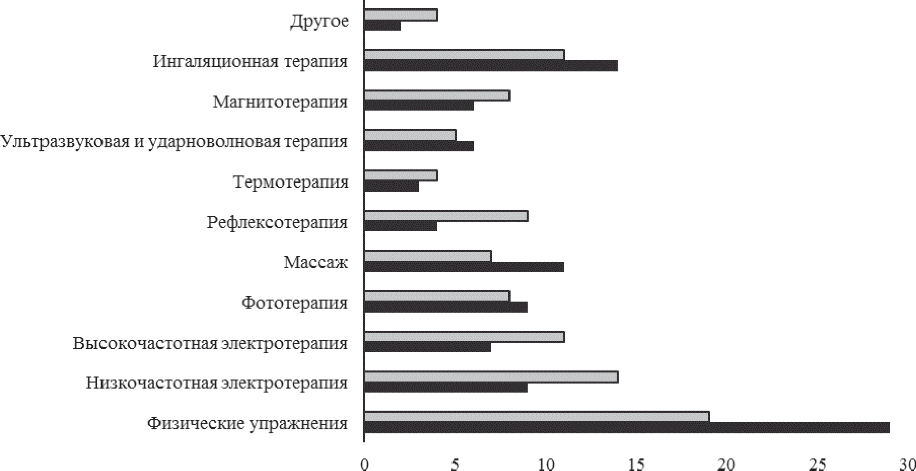 Анализ программ медицинской реабилитации показал, что в структуре программ группы наблюдения доля таких технологий физической и реабилитационной медицины, как физические упражнения, массаж, фототерапия и ингаляционная терапия, была выше, чем в группе сравнения. Это является следствием использования в группе наблюдения персонализированных технологий, содержащихся в клинических рекомендациях, обладающих доказанной эффективностью и соответствующих профилю основного заболевания (рис.).