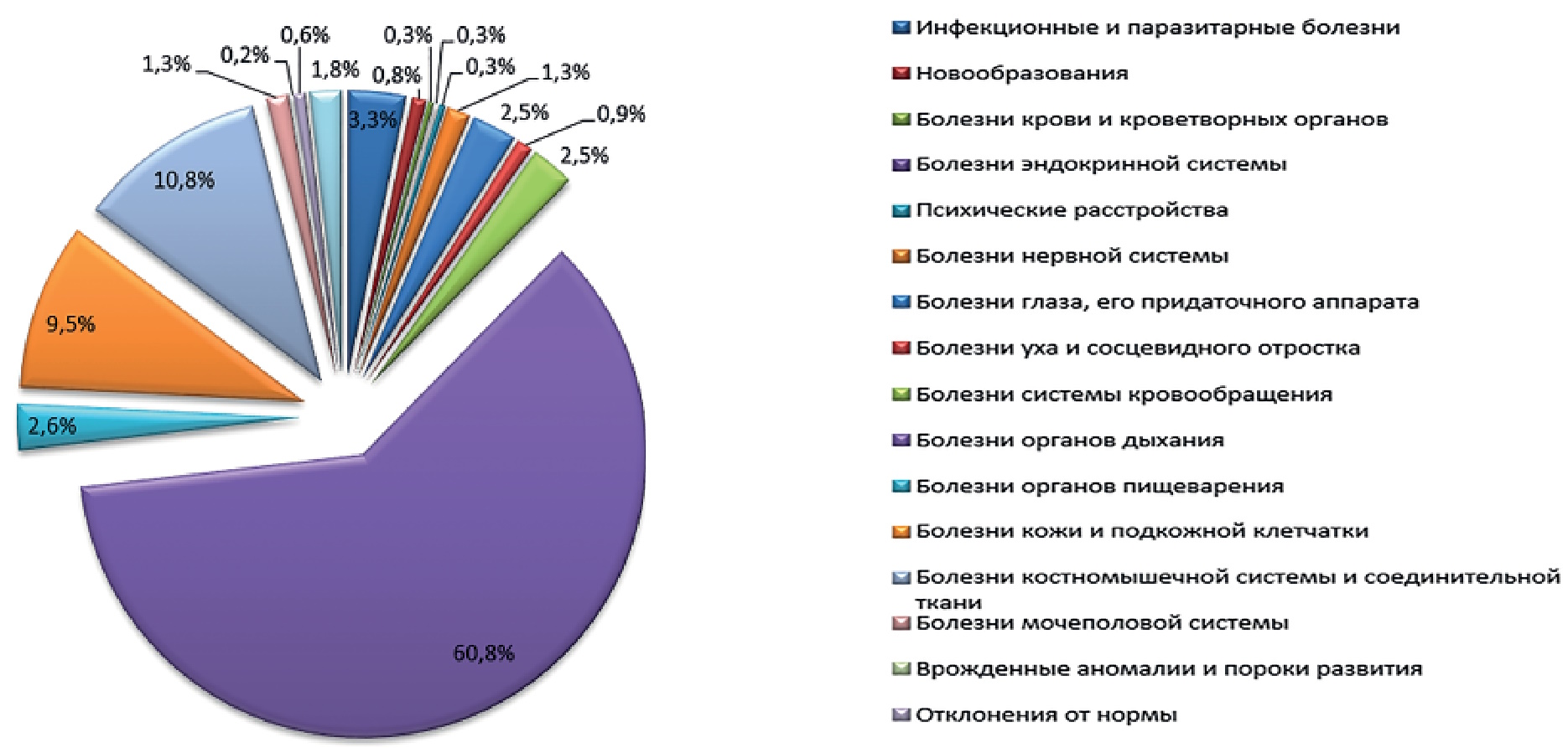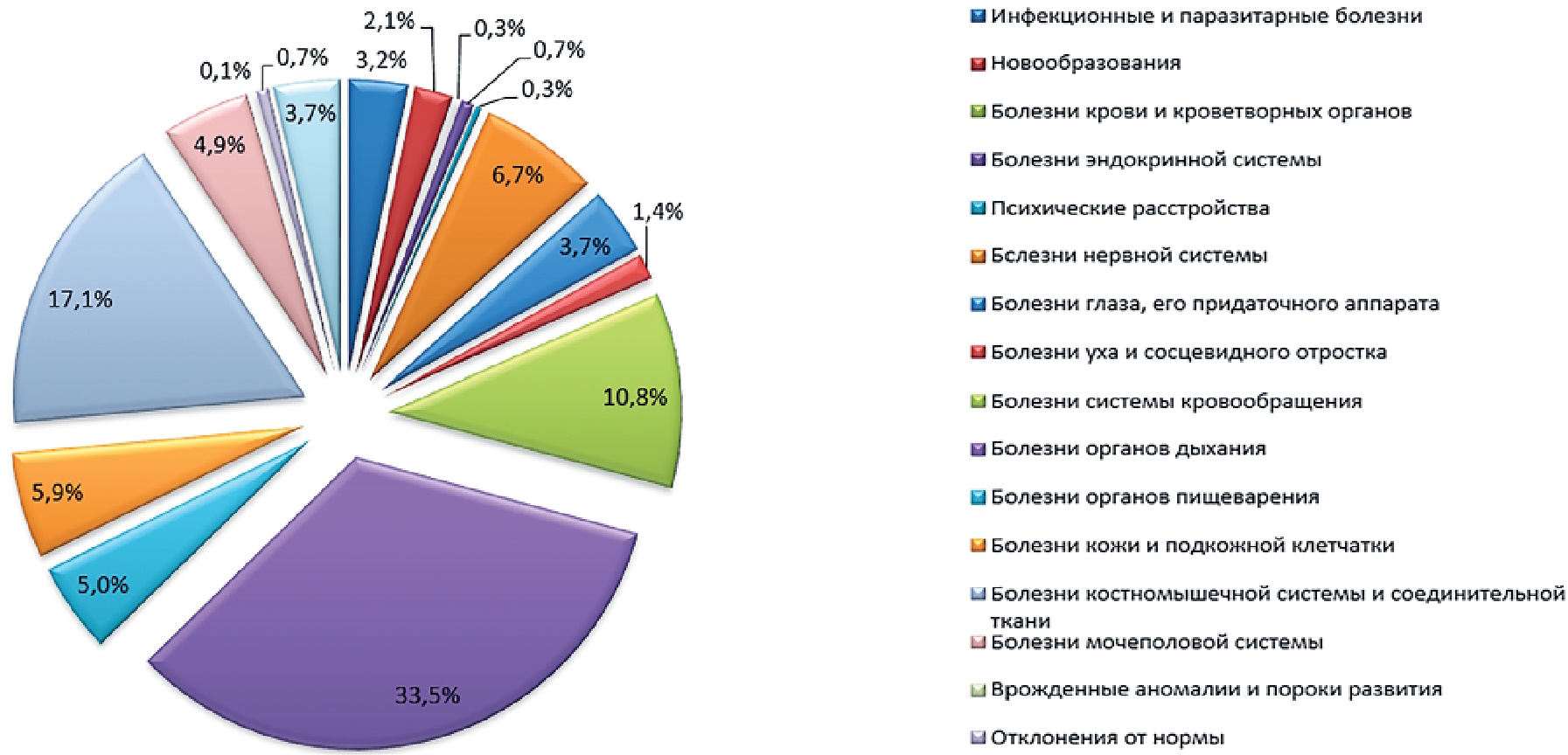Рис. 1. Структура общей заболеваемости по классам болезней военнослужащих по призыву ВОО по среднемноголетним данным за период с 2013 по 2018 г.