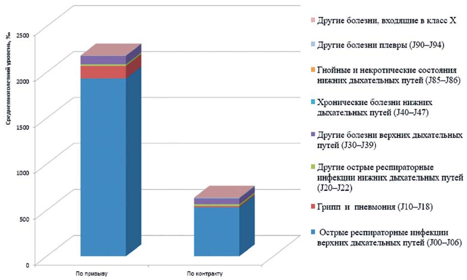Цель исследования. Провести эпидемиологический анализ заболеваемости болезнями органов дыхания военнослужащих по призыву и по контракту военной образовательной организации.