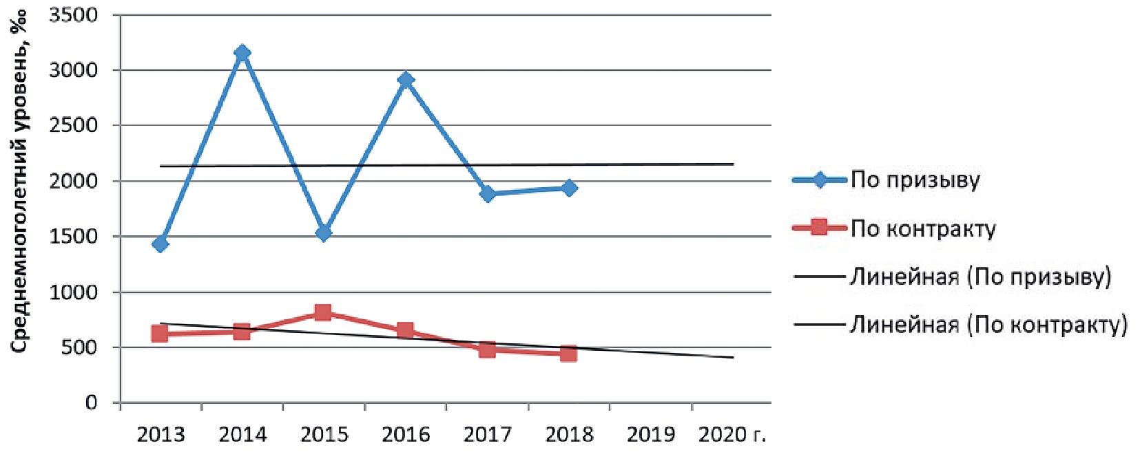 Рис. 4. Многолетняя динамика общей заболеваемости БОД военнослужащих по призыву и по контракту ВОО за период с 2013 по 2018 г. (на 1000 чел.)