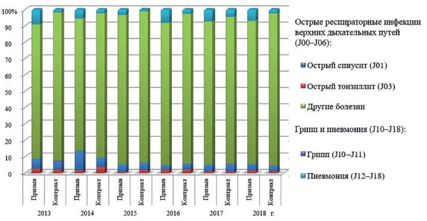 Наибольший вклад в общую заболеваемость БОД как у военнослужащих по призыву, так и по контракту вносит блок «Острые респираторные инфекции верхних дыхательных путей (J00–J06)», а именно острый синусит, острый тонзиллит и другие болезни, входящие в этот блок (острый фарингит, острый назофарингит, острый ларингит и трахеит и др.). У военнослужащих по призыву и по контракту они в среднем составляют 94,2% от всех заболеваний БОД. Доля заболеваемости гриппом в среднем составляет менее 1%. Доля заболеваемости пневмонией военнослужащих по призыву и по контракту в среднем составляет 5,7% (рис. 5).