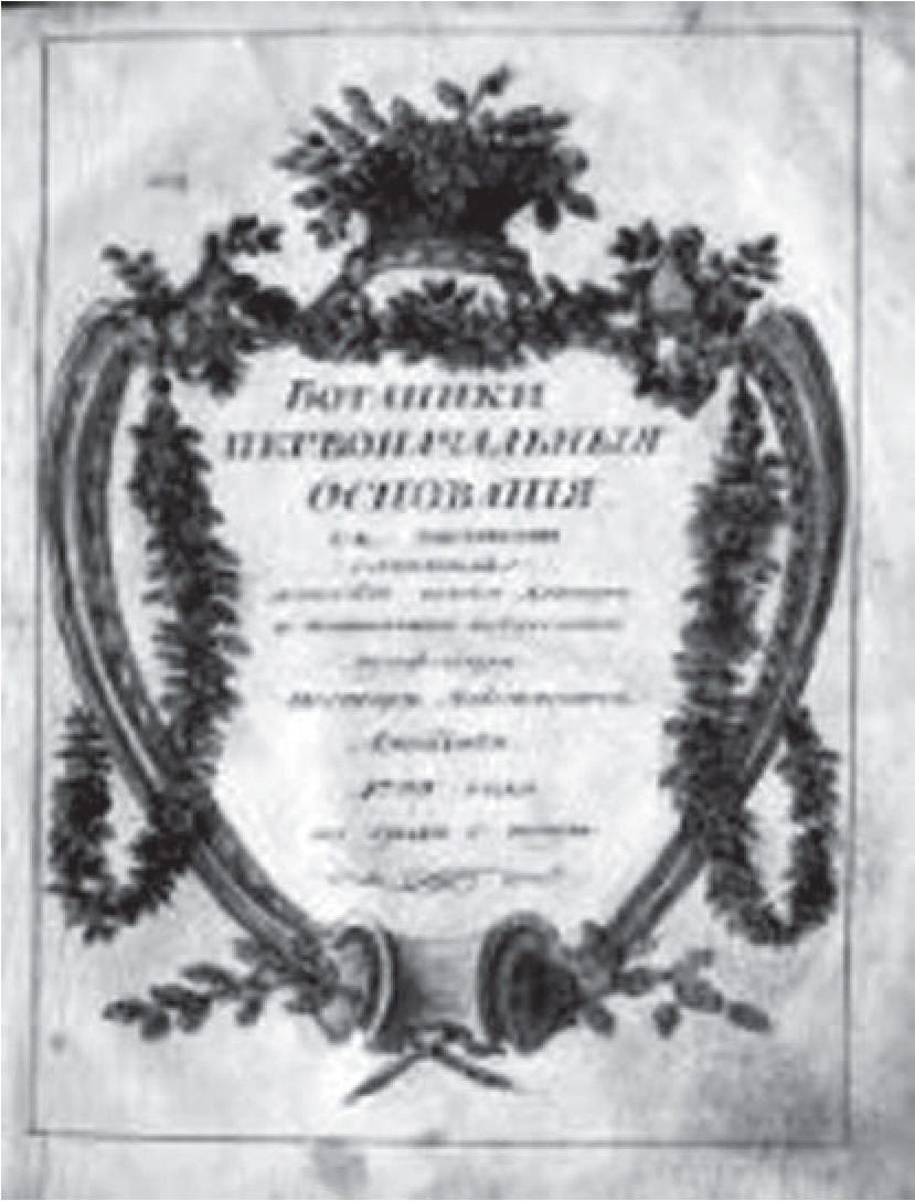 Первый период. При учреждении МХА (1798 г.), преобразованной из Врачебного училища [2], среди первых семи кафедр была создана кафедра ботаники. Учебной базой кафедры был знаменитый Ботанический сад на Аптекарском острове. Ботанику с основания академии и до 1803 г. преподавал профессор Григорий Федорович Соболевский, автор фундаментального труда «Флора Санкт-Петербургской губернии». Эстафету чтения предмета принял у него профессор фармации Т.А. Смеловский. Большое внимание в преподавании ботаники в этот ранний период уделялось демонстрации живых растений, не реже одного раза в неделю назначались ботанические экскурсии. Учебным руководством первоначально служило пособие «Первоначальные основания ботаники» Н.М. Амбодика-Максимовича (1795) (рис. 1), позднее замененное «Философией ботаники» К. Линнея в сокращенном русском переводе Т.А. Смеловского (1800). Доктор медицины и хирургии, академик Т.А. Смеловский был инициатором и организатором при МХА первой в России высшей фармацевтической школы по подготовке провизоров. Его сменил профессор Ф.Х. Стефан (1804 г.), а затем И.Ф. Рудольф [1]. Профессор Я.В. Петров составил список культивируемых в саду растений.