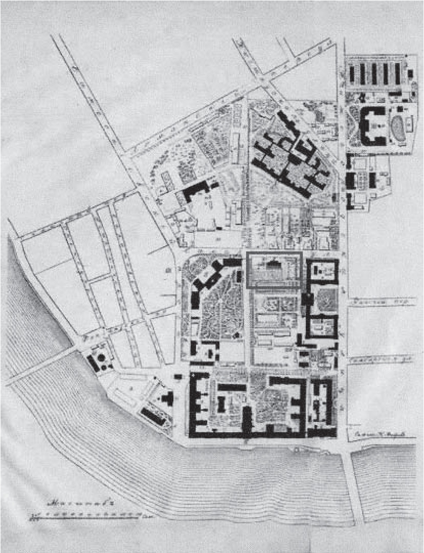 Рис. 3. План Императорской медико-хирургической академии. 1898 г. Опубликовано: «История Императорской военно-медицинской (бывшей медико-хирургической) академии за 100 лет: 1798–1898». – СПб., 1898. Вклейка. Ботаническая лаборатория с оранжереей обозначена на плане по ул. Самарской (ныне – Боткинской)