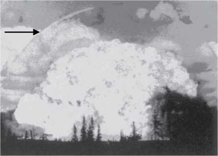 Рис. 1. Взрыв ВВ большой мощности. Стрелкой показан фронт ударной волны.