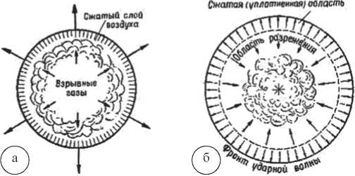 Быстро расширяющиеся при взрыве газы вытесняют окружающий воздух в стороны, сжимая его. Плотный слой сжатого воздуха распространяется от источника взрыва в форме шара или полусферы, образуя воздушную ударную волну (ВУВ). Передняя граница зоны сжатия носит название фронта ударной волны и характеризуется чрезвычайно высокими значениями избыточного давления (рис. 1).