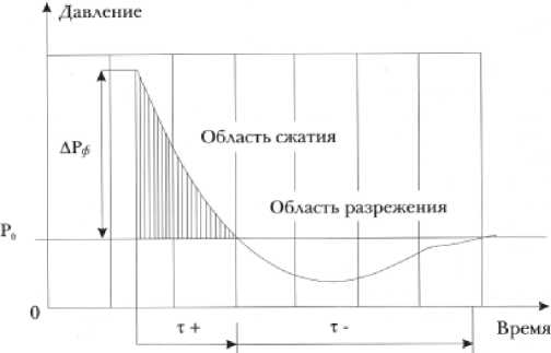 Основными параметрами, характеризующими ударную волну любой природы, являются избыточное давление в фронте (ΔРф), а также длительность положительной фазы или фазы сжатия (τ+) и длительность отрицательной фазы, или фазы разрежения (τ_), время нарастания давления во фронте УВ (Δτ), импульс давления (i) и др. (рис. 3).