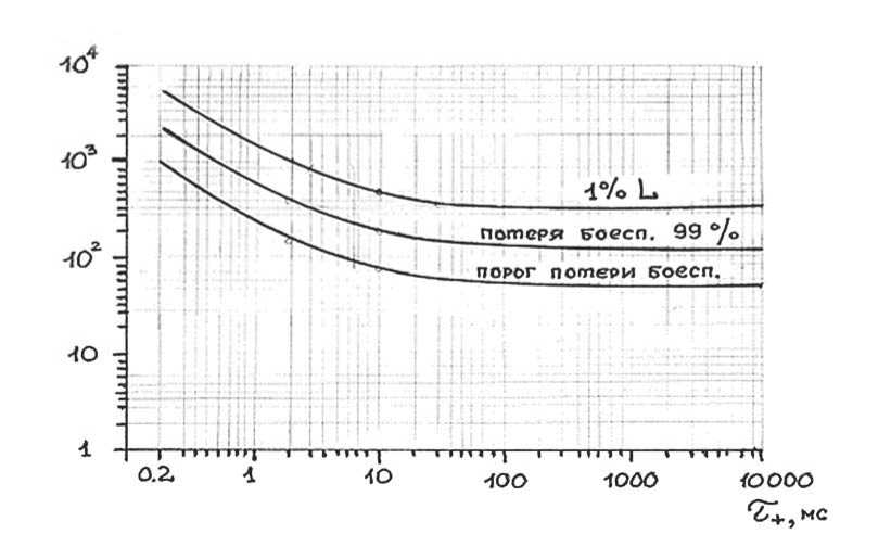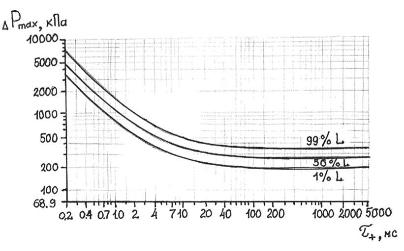 На основе опытов, проведенных на 3000 животных различной массы (крысы, морские свинки, кролики, свиньи, овцы и пр.). сотрудниками исследовательской группы «LovelaceFundation» [9] в 1962-1966 гг. был проведен регрессионный анализ вероятности летального исхода в зависимости от массы животного и параметров ударной волны (ΔР, τ+). Полученные зависимости и расчетные данные позволили провести экстраполяцию этих результатов на человека и построить кривые поражения для вероятностей 1, 50 и 99% в координатах пикового давления во фронте ударной волны (ΔР, кПа) и длительности (τ+, мс) положительной фазы ВУВ. При этом воздействие на человека рассматривалось в проходящей волне при расположении продольной оси человека перпендикулярно направлению взрывной волны (рис. 4).