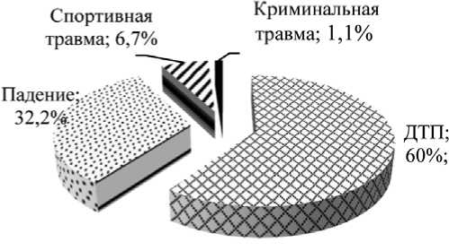 Результаты и их обсуждение. Установлено, что у 54 (60%) пострадавших причиной ЧМТ послужило ДТП, у 29 (32,2%) - падение, у 6 (6,7%) - спортивная травма и у 1 (1,1%) - криминальная травма (рис. 1).