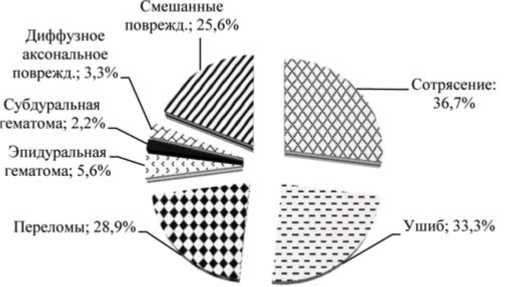 При КТ у пострадавших были выявлены различные повреждения головного мозга (рис. 2)