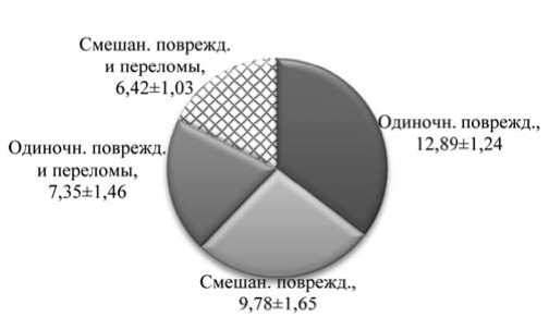 У пациентов со смешанными повреждениями в сравнении с одиночными повреждениями величина средних значений ШКГ была статически значимо (р<0,05) ниже на 24,1%. Средний показатель ШКГ у пациентов с одиночным поражением+переломами составил 7,35±1,46 балла, что по сравнению с одиночным и смешанным повреждением было ниже на 43 и 24,9% (р<0,05) соответственно. Минимально низкие средние баллы отмечались у пациентов со смешанными повреждениями в сочетании с переломами - 6,42±1,33, что в среднем было ниже показателя у пациентов с одиночным повреждением и переломами на 12,7%, а в сравнении с одиночным и смешанным поражением на 50,2 и 34,4% (р<0,05) соответственно.