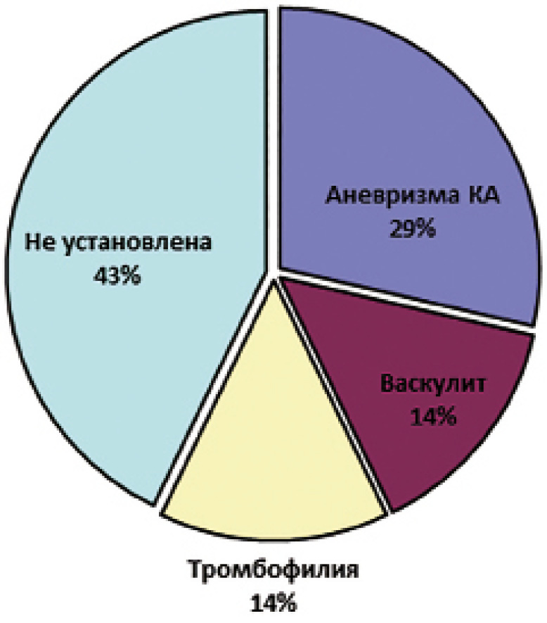 Установлено, что в 2 (29%) случаях причиной ИМБОКА явилось аневризматическое изменение КА с дистальной тромботической окклюзией. По одному случаю были представлены наследственная тромбофилия (тромботическая окклюзия) и эозинофильный гранулематозный полиангиит (вазоспазм). В 3 (43%) случаях ИМБОКА причина окклюзии КА (тромбоз/эмболия?) достоверно не установлена (рис. 1).
