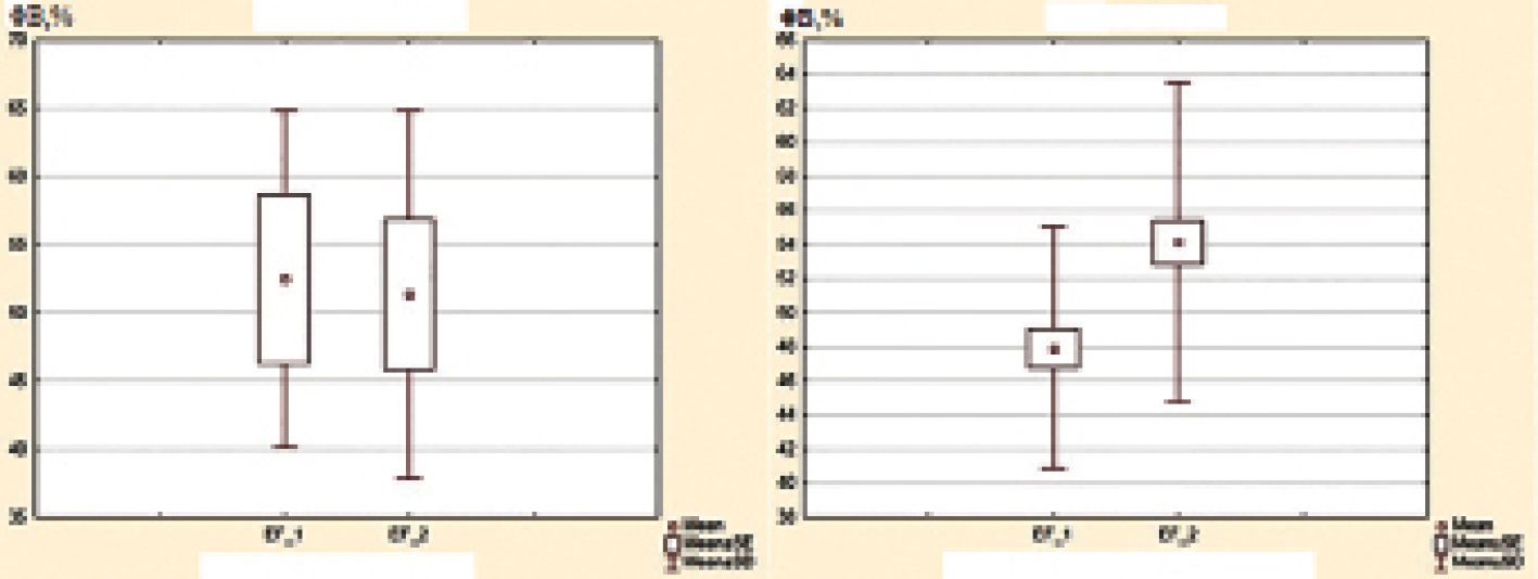 Крайне важным представляется сравнение результатов ЧКВ. Так, если в КГ через 10–14 дней после реваскуляризации миокарда наблюдалось достоверное улучшение сократительной способности ЛЖ, то в ОГ величина фракции выброса ЛЖ после реваскуляризации миокарда почти не изменилась (рис. 2).