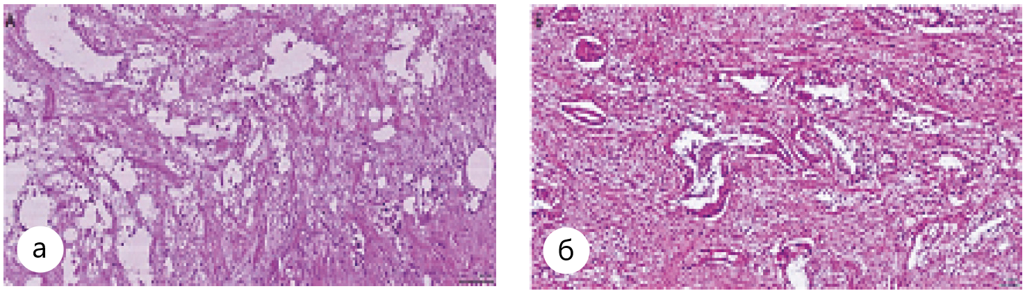 Рис. Морфологическое исследование препарата больной Ф., 61 г., на 10-е сутки после масляной химиоэмболизации nab-паклитакселом: а – участки некроза в ткани головки ПЖ вне опухоли; б – неизмененная ткань на уровне тела ПЖ (край резекции). Окраска гематоксилином и эозином, ув. ×400